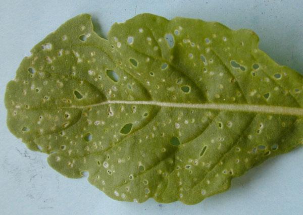 Adult flea beetles feed on the cotyledons and foliage, producing small pits or ‘shot-holes’ that make leafy herbs unmarketable. Seedlings and rootlets can also be attacked underground, leading to plant losses or reduced plant vigour. The leaf mines produced by the larva of Phyllotreta nemorum disfigure leaves and/or cotyledons.