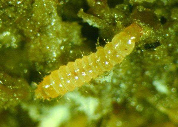 The ground-dwelling predatory ‘rove’ beetle, Atheta coriaria is commercially available for the control of both sciarid and shore flies. The adult beetle is small, about 3-4mm long, dark brown and shiny, with short wings and an upturned rear end (Fig. 9). The adults are very active and can both run and fly, but often remain hidden within the growing substrate and under pots. The female beetles lay eggs in the compost or soil and the eggs hatch into the first stage larvae, which are small and milky white. There are three larval stages, the oldest larvae being about 3-4 mm long and brownish yellow (Fig. 10). When fully developed, the oldest larvae build pupation chambers in the growing medium out of soil particles held together with silk, thus they are not readily visible at this stage. Both adults and larvae feed on a range of prey, including sciarid and shore fly eggs and larvae.