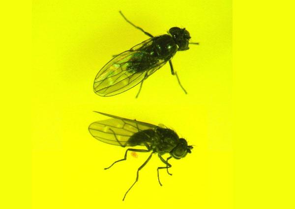 The ‘hunter fly’, Coenosia attenuata, is a naturally-occurring predator of various pests, including sciarid flies, shore flies, leaf miners and whiteflies. The greyish adult flies are 2.5-4 mm long and resemble small house flies http://web.agrsci.dk/plb/iobc/sting/sting29.pdf). The adult catches its prey, e.g. adult shore flies, in flight, and leaves the prey bodies behind when it has sucked out the body fluids. Coenosia larvae are predatory on ground-dwelling prey, e.g. sciarid and shore fly larvae. Research is being done in the USA on the potential of Coenosia as a commercial biological control agent.