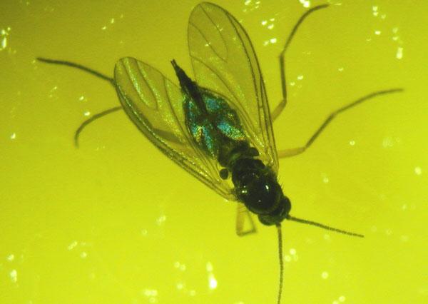 Sciarid flies damaging herbs and other glasshouse crops are usually Bradysia difformis (formerly known as Bradysia paupera), but other species of Bradysia and some Lycoriella spp. may also cause damage. The adult is a small, black, gnat-like fly, about 2-3 mm long, with iridescent wings (Fig. 1), often seen resting on the compost or pots, or flying weakly around the plants. They are also commonly found on yellow sticky traps used for pest monitoring (Fig. 2). Sciarids can be distinguished from shore flies and other black flies by their long legs, long, beaded antennae and a distinctive Y-shaped vein on each wing. The adult females are attracted to damp compost or substrate in which to lay their eggs, particularly highly organic composts and those containing ‘green’ waste. The flies seem to be particularly attracted to pots of freshly germinated parsley, which are favourite host plants. However, a wide range of young herb plants can be attacked. The larvae are transparent legless maggots, up to 5 mm long, with shiny, spherical black head capsules (Fig. 3). They can be found around the roots of host plants and sometimes on the surface of the compost. The green or brown gut contents of the larvae can be seen through the transparent body wall. The pupae develop in the compost, then emerge into the next generation of adults.