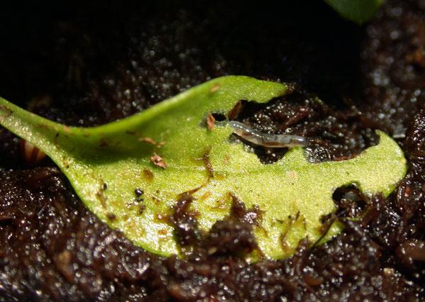 Sciarid larvae infected with Furia sciarae, on surface of compost (left) and close-up (right)