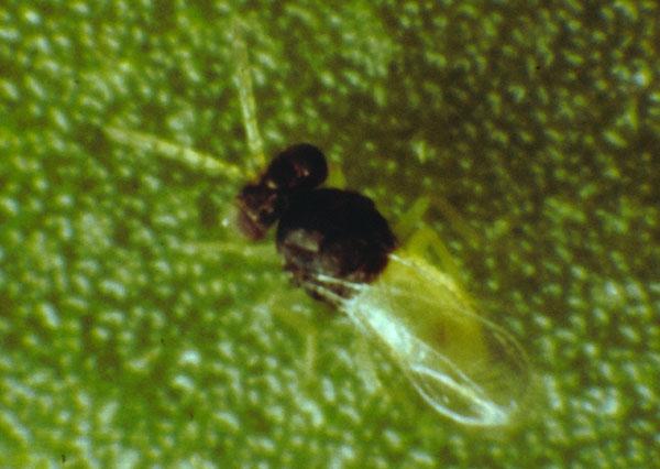This yellow and black parasitic wasp is only about 0.6 mm long (Fig. 5). Encarsia is more effective against the glasshouse whitefly than the tobacco whitefly, and kills whiteflies in two ways. Firstly, it acts like a predator, by ‘stinging’ the young whitefly scales and sucking out the body fluids. This is known as ‘host-feeding’. Secondly, Encarsia acts as a parasitoid, where the female wasp lays individual eggs in each whitefly scale (preferring the third or fourth scale stages) and the young parasitoid then develops inside the body of the whitefly scale. Parasitised glasshouse whitefly scales turn black (Fig. 2). Those of tobacco whitefly turn yellowish brown, and the yellow and black body of the developing Encarsia adult can be seen inside (Fig. 6). When fully developed, the adult Encarsia emerges from a round hole cut in the top of the scale. Host-feeding could play a more important role than parasitism in whitefly control on fresh herbs, on which there is ‘zero tolerance’ of pests, as it causes the small scales to shrivel and die before they reach the preferred (and more visible) stage for parasitism.