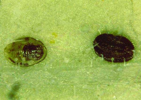 Glasshouse whitefly scale (right) and tobacco whitefly scale (left) parasitised by Encarsia formosa