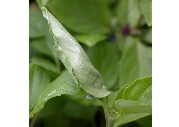 Many caterpillars chew holes in the leaves (Fig. 10). Young caterpillars e.g. angle-shades moth can produce ‘windows’ in the leaf, where only the underside is removed, leaving the upper surface intact. Caterpillar damage can usually be distinguished from slug or snail damage by the presence of caterpillar droppings (‘frass’, often barrel-shaped) on the leaves (Fig. 11) and the lack of slime trails. The leaf-rolling and webbing caterpillars (carnation tortrix moth and mint moth) roll the leaves up and spin them together with silk to form a shelter in which to hide and feed (Figs 8 and 12). Cutworms such as the caterpillars of the turnip moth feed on the leaves when young but older cutworms feed underground and can sever the stems. A summary of symptoms caused by different caterpillar species on herb crops is given in Table 1.