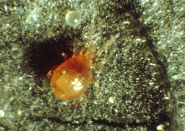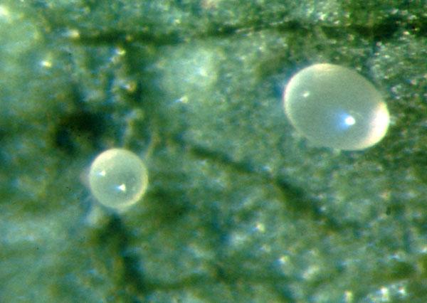 All stages of two-spotted spider mite (TSSM) are usually found on leaf undersides. The young mites and summer adults are up to 0.5 mm long, light green in colour, with two darker lateral marks on their backs (Fig. 1). In September or October, in response to shortening daylength and cooler temperatures, and also earlier in the year in heavy infestations when plants are senescing, adult females turn a brick-red colour (Fig. 1). The brick-red females that appear in the autumn find a sheltered place in the structure of the glasshouse or tunnel, or in plant debris, to hibernate. Over-wintered adults become active again in the spring, in response to increasing temperature and daylength. They move onto host plants , where they feed and lay small, clear, round eggs on leaf undersides (Fig. 2). The eggs hatch into 6-legged larval mites, that feed on the leaves and develop through two 8-legged nymphal stages into adults.
